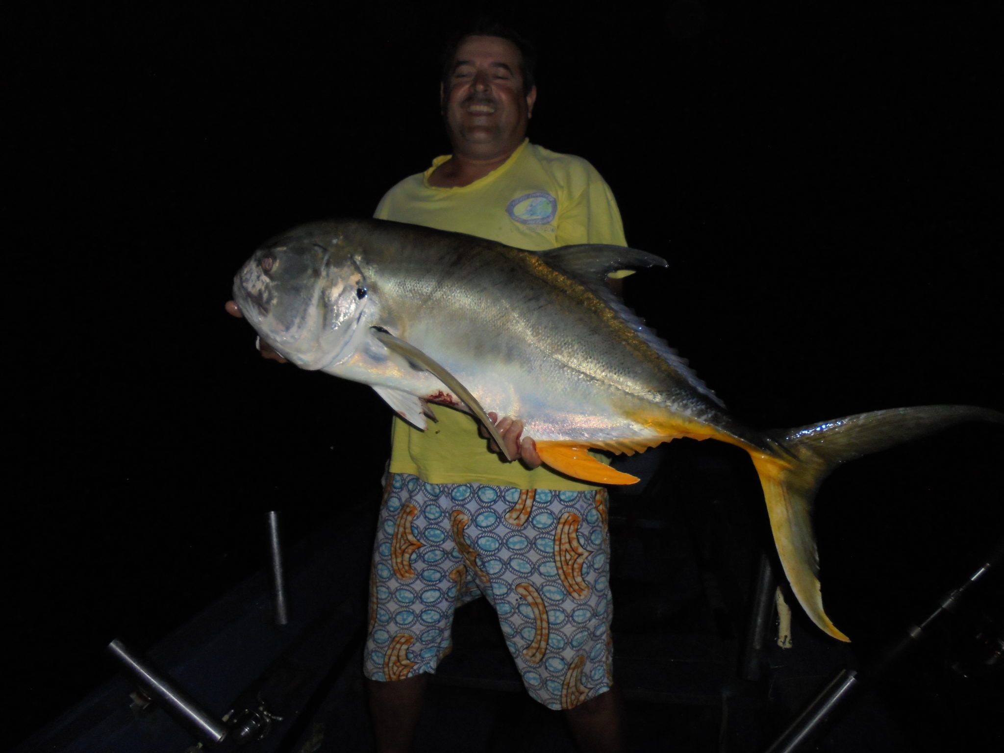 C’est au tour de Xavier de voir son moulinet se vider de sa tresse. Le frein est mis à rude épreuve et ce n’est qu’après vingt longues minutes d’incertitude que se rend une magnifique African pompano ornée de sa parure acier. Un peu moins de 20 kilos, cela restera longtemps gravé dans les mémoires. Quel beau poisson… Bravo Xavier !
