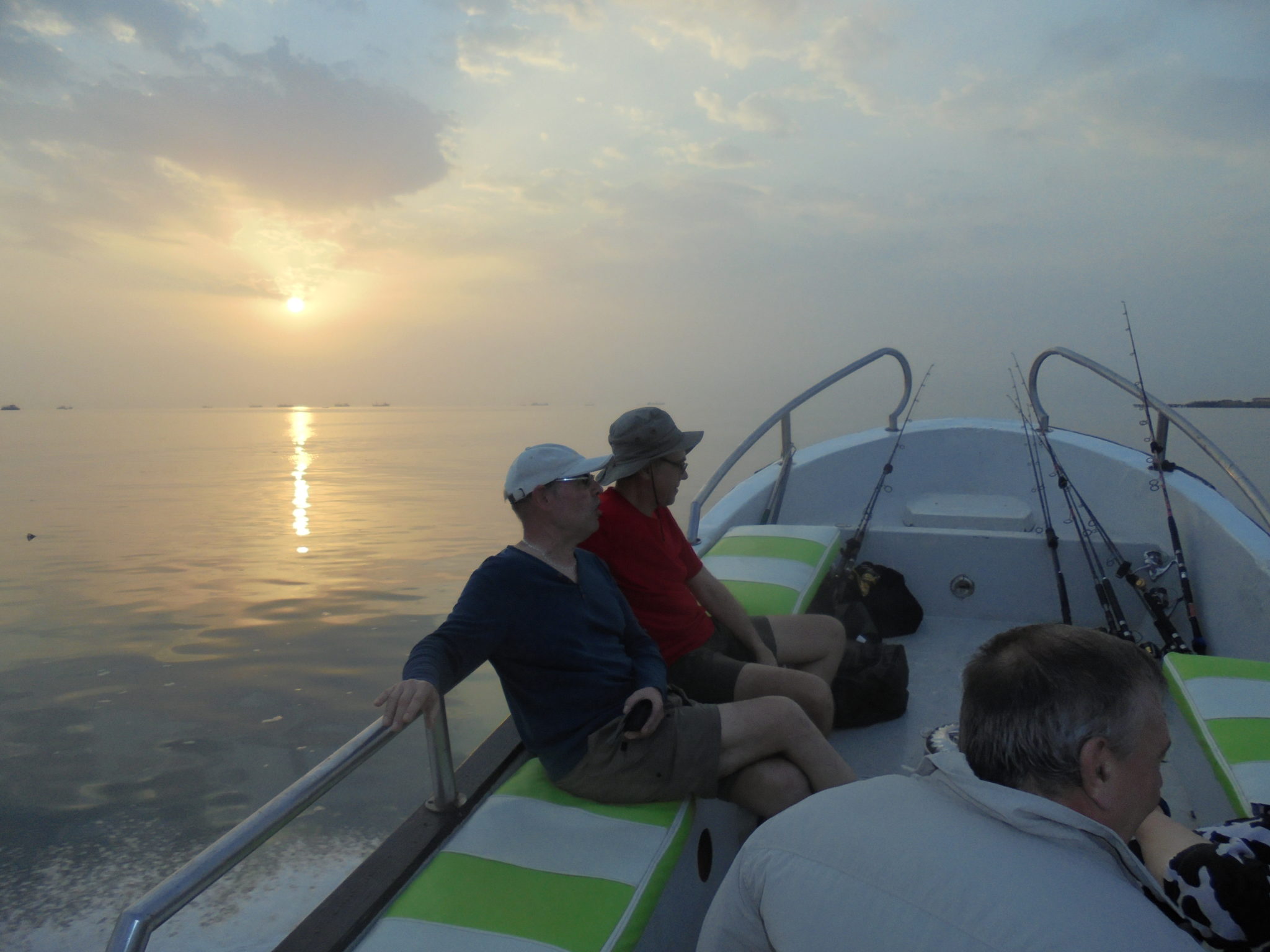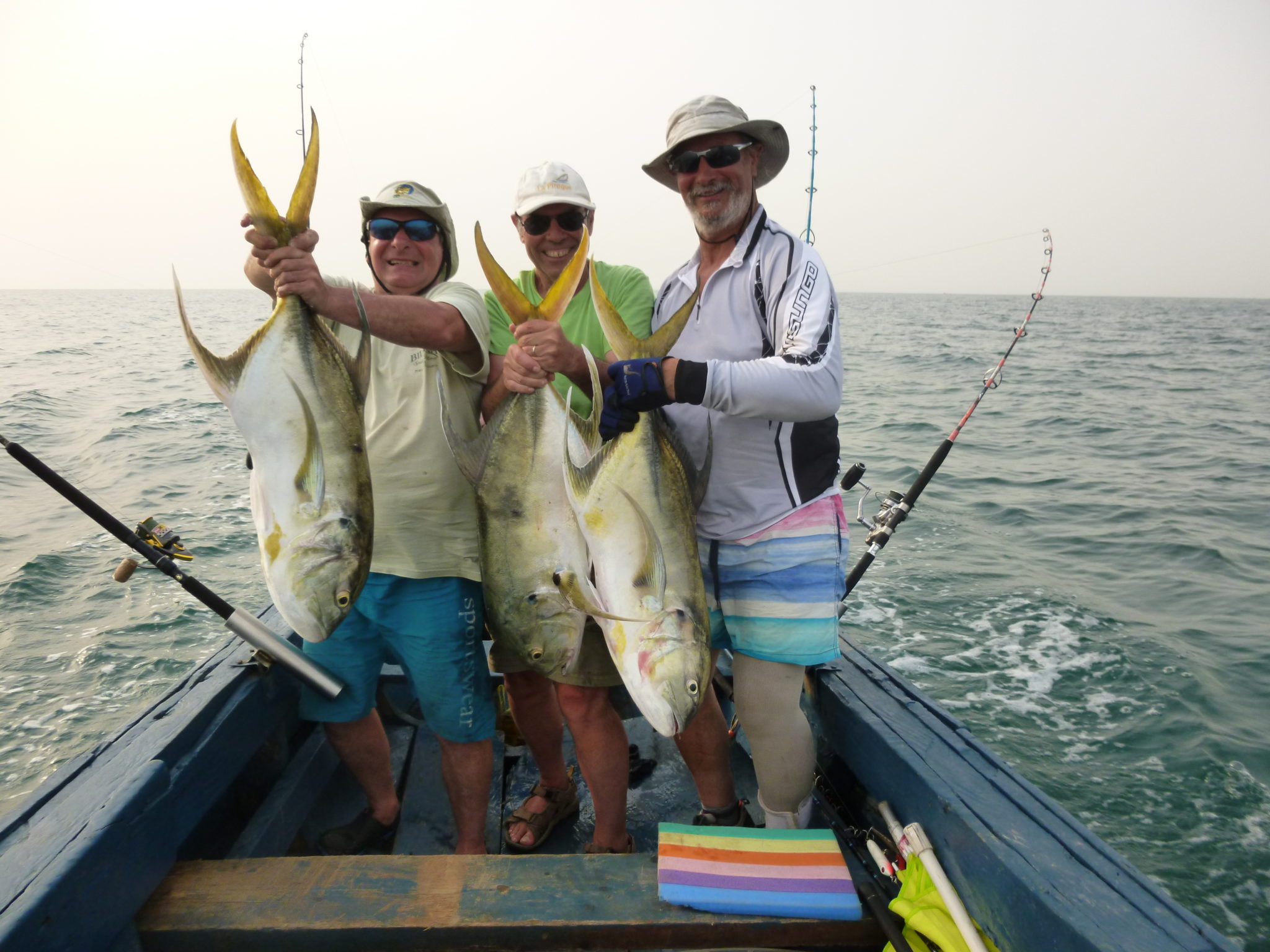 Puis les choses continuent à s’accélérer, et après un petit tour aux barras le matin, on repart l’après -midi à la chasse aux chasses… Des petits poissons sont rentrés près de la côte, et les prédateurs sont de sortie!! de magnifiques chasses s’organisent surveillées de très près par plus de cent sternes et ça commence à bouillonner de partout. La difficulté est d’approcher suffisamment des chasses avant qu’elles ne filent plus loin, et les pirogues longues mais lourdes ne se manient pas comme un petit open. Les sternes nous font parfois tourner en bourriques, mais sont de précieux indicateurs sur la future place des bouillons!! La ténacité et la technique finissent par payer, et les cannes arc-boutées plongées dans l’eau à l’approche du bateau témoignent de la vigueur de nos partenaires de pêche… Grâce à des cours délicatement prodigués: « lance à gauche, à gauche NdD!!! » nous arrivons à faire plusieurs triplés simultanés lors de la plus belle sortie qui nous éloignera pas mal de la côte à la poursuite d’un banc de grosses!!mais le résultat sera là et le soir un profond sentiment de satisfaction nous procurera un sommeil serein. Encore deux jours puis le temps du retour s’annonce, et le vol vers la France se fera avec le plein de beaux souvenirs de pêche, avec un groupe très convivial et par un surplus de blagues de qualité distillées par d’intarissables conteurs….Vivement la prochaine!!!