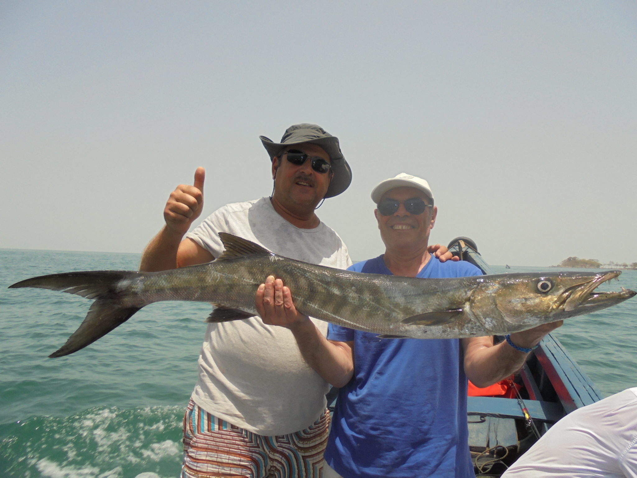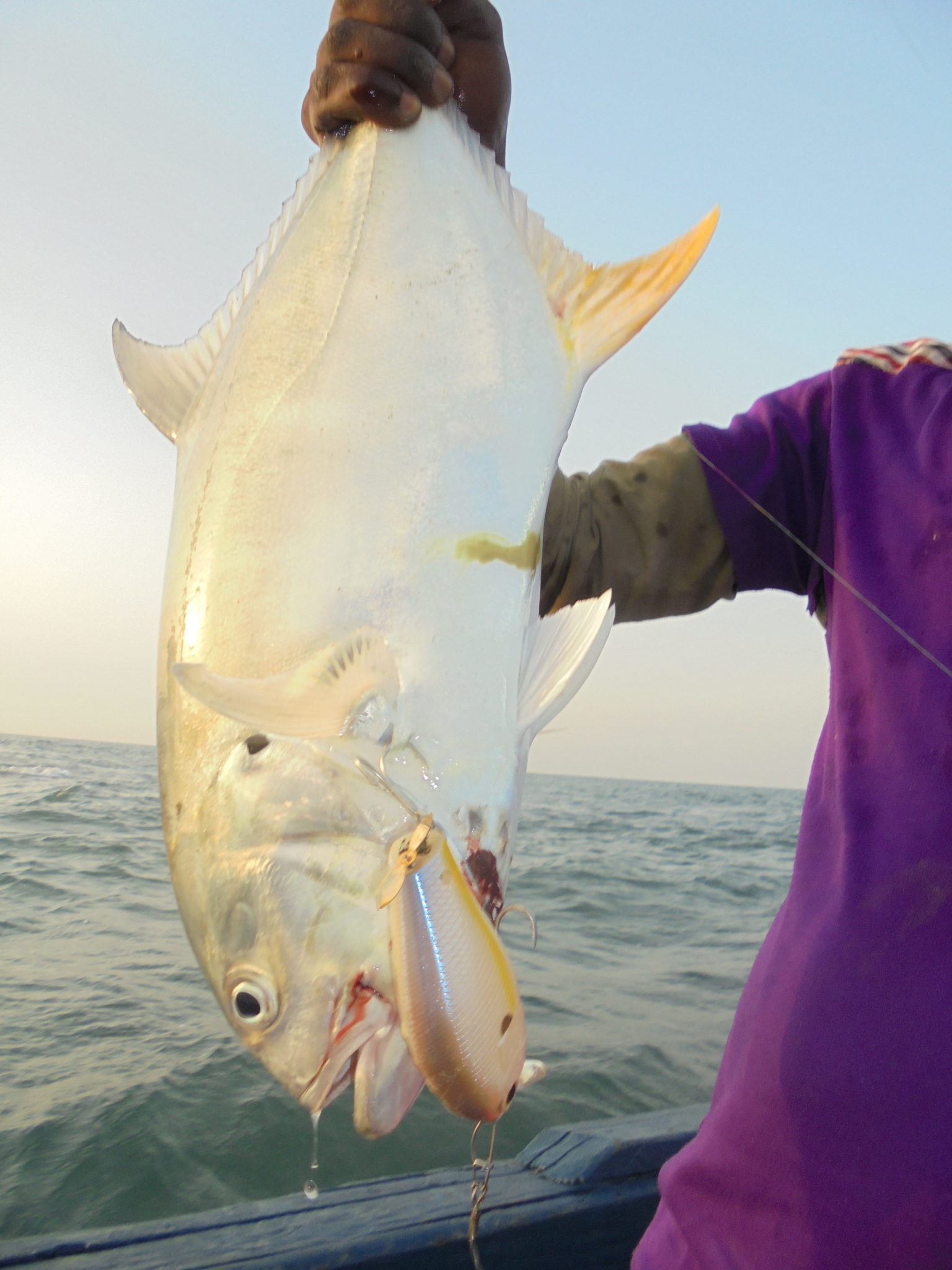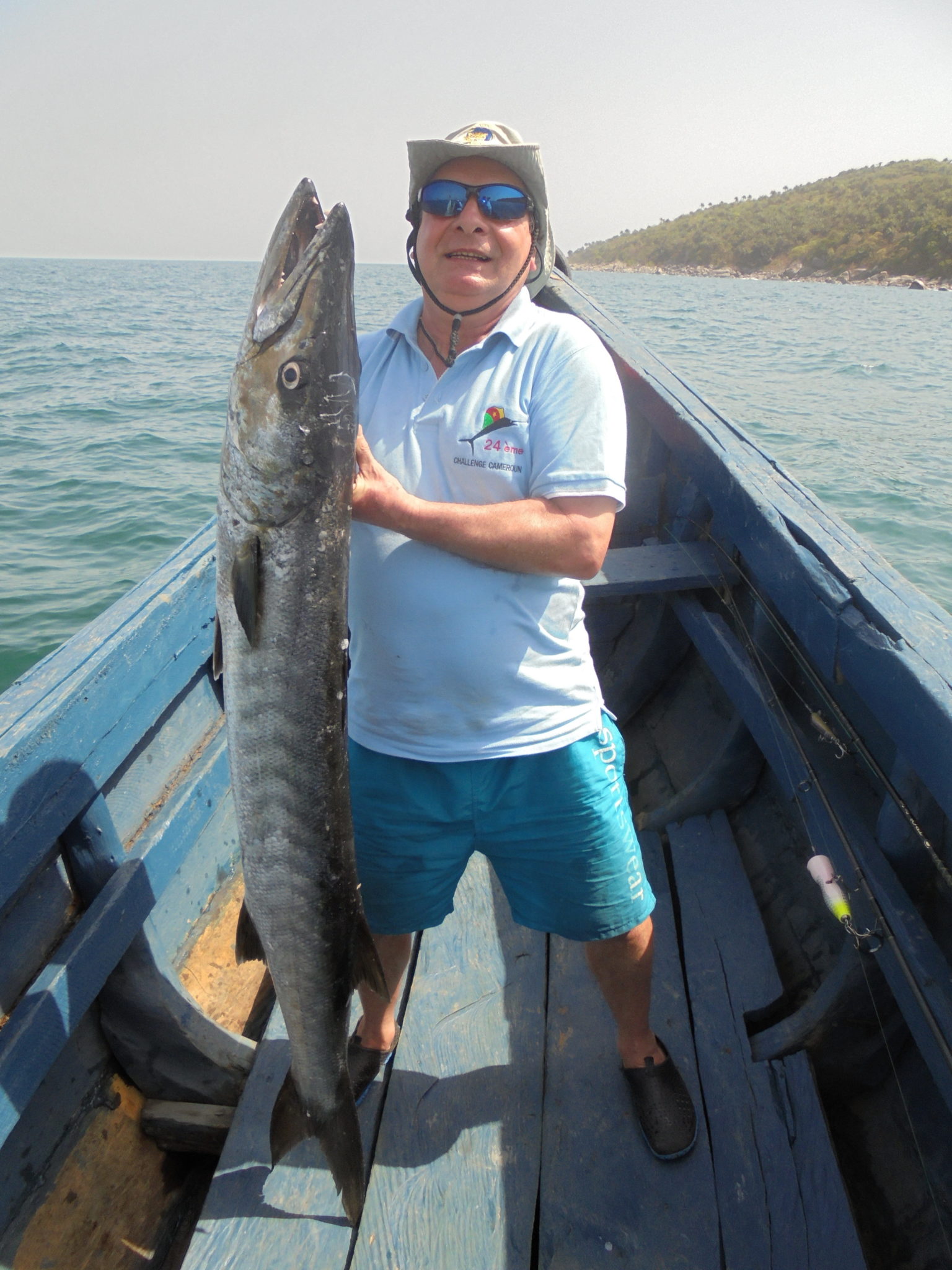 A la pêche, on débute par de gros coef qui nous permettent de pêcher l’eau » verte » à la montante et de toucher des barras de taille variées et quelques carangues sur des chasses furtives…qu’il faut très vite exploiter…En passant devant Plage rouge , on surveille de plus près les cannes à cause des tarpons, mais ceux- ci resteront cette fois à distance prudente des leurres de traîne….ce sera pour une prochaine fois..Ensuite , l’expédition sur l’épave du large avec le gros open ne donnera pas les résultats espérés, les bonnes places étant déjà prises par des locaux qui arrivent à toucher quelques barras en catapultant d’antiques rapalas directement avec le fil…..à voir!!